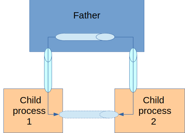 Et si on combine les deux ça permet un schéma assez intéressant: un processus père qui orchestre, il lance deux processus fils avec lesquels il garde un canal de communication via une socketpair. Il peut créer une autre socketpair, et en passe un bout à chaque fils en utilisant passfd: